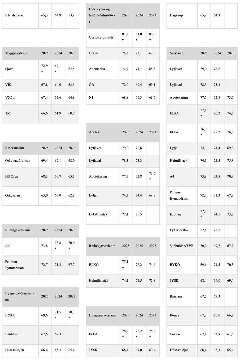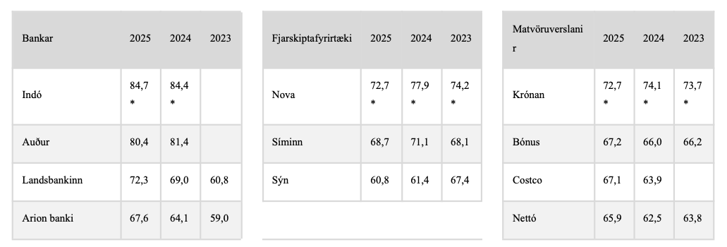 Niðurstöður sýna að þau fyrirtæki sem mælast með hæstu ánægju viðskiptavina eiga það sameiginlegt að vera nýskapandi, leggja áherslu á þjónustu og sterka stafræna upplifun, oft á mörkuðum sem hafa tekið miklum breytingum á undanförnum árum.