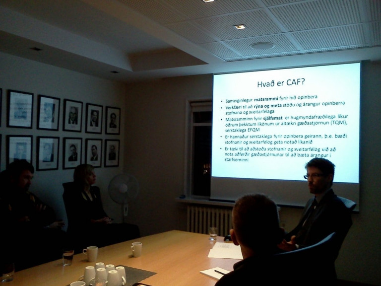 Pétur B. Matthíasson frá Fjármála- og efnahagsráðuneytinu fjallaði um CAF sjálfsmatslíkan fyrir stofnanir og sveitarfélög, en ráðuneytið hefur nýlega opnað upplýsingavef fyrir CAF, sem hann kynnti. Hallgrímur H. Gröndal fjallaði um CAF reynslu hjá Ríkiskaupum. Um 20 manns sóttu fundinn.
