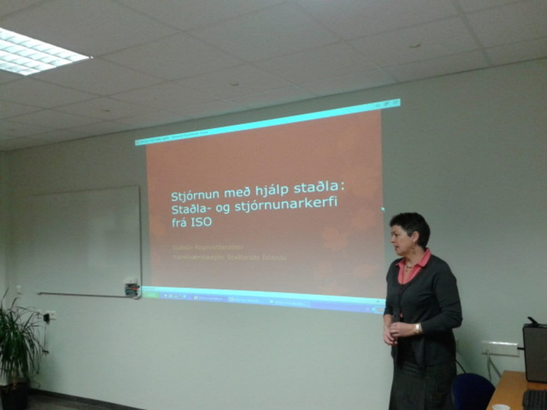 Anna Guðrún Ahlbrecht gæðastjóri Landmælinga setti í morgun fund í Tollhúsinu sem var á vegum faghópa um ISO og gæðastjórnun. Fundurinn var vel sóttur og komust færri að en vildu. Anna Guðrún kynnti Stjórnvísi og efni fundarins jafnlaunastaðallinn ÍST 85 sem gefinn var út árið 2012 og verið er að innleiða víða hér á landi. Markmið með útgáfu staðalsins er að auðvelda atvinnurekendum að koma á launajafnrétti kynja á sínum vinnustað.