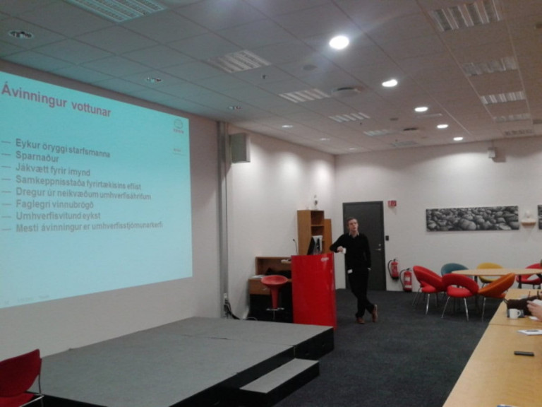 Guðmundur Kjerúlf Vinnueftirlitinu fjallaði um áhættumat starfa. Áhættumatið er þannig að farið er skipulega yfir vinnuumhverfið og reynt að meta hvort það geti valdið heilsutjóni og skipuleggjum úrbætur. Markmiðið er að 1. við komum heil heim úr vinnu 2. Starfsmenn fái verkefni við hæfi og stuðla að andlegri og líkamlegri aðlögum þeirra að starfsumhverfinu 3. Draga úr fjarvistum frá vinnu 4. Stuðla að félagslegri þátttöku. Félagslegir og andlegir þættir verða mest útundan á vinnustað. Aðferð við gerð áhættumats er frjáls, en hún verður að vera skrifleg, greina þau vandamál sem eru á vinnustað og yfirfara slysaskrá a.m.k. einu sinni á ári. Forvarnir Vinnueftirlitsins eru í 3 stigum. Því miður eru ekki nægilega margir í 1.stigs forvörnum sem er að fjarlægja hættur. Á heimasíðu Vinnueftirlitsins eru gátlistar. Sértækir vinnuumhverfisvísar eru félagslegur og andlegur aðbúnaður á vinnustað, ánægjukönnun fyrir starfsfólk á vinnustöðum. En hvernig er staðan í raun og veru? Nýlega var gerð úttekt i fiskvinnslu á Íslandi og hefði hún mátt koma miklu betur út. Öryggi skapast stig af stigi. Grunnurinn verður að vera í lagi. Andlega og félagslega matið. Ný reglugerð nr.1009/2015 um aðgerðir gegn einelti, kynferðislegri áreitni, kynbundinni. Skoða á fjölda starfsmanna, aldur, kynjahlutfall, ólíkan menningarlegan bakgrunn, örðuleika í tengslum o.fl. Oft er verið að vinna í langtíma tímaþröng, er verklýsing óljós, er mikið um einhæfni, lítið athafnafrelsi, svigrúm, starfsþróun. Hvernig eru samskiptin, upplýsingaflæði, of lítill stuðningur frá stjórnendum og samstarfsmönnum, lítið umburðarlyndi, einelti og kynferðisleg áreitni. En hvað skiptir máli? Hvað gerum við best, lærum af því. Guðmundur sagði frá OiRA= Online interactive Risk Assesssment sem er rafrænt gagnvirkt áhættumat, hugsað fyrir fyrirtæki með 50 starfsmenn og færri. Þetta er hugbúnaður um áhættumat sem er opinn öllum og ókeypis. OiRA skiptist í 5 hluta, undirbúning, greiningu, mat, aðgerðaráætlun og skýrsla.