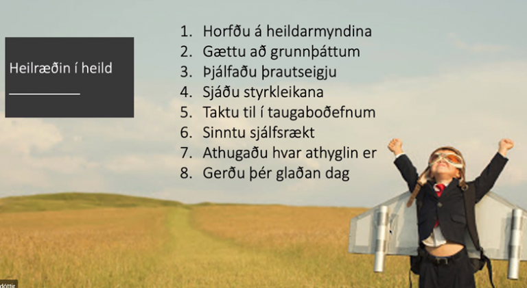 Nú er það úthaldið og við erum ólík varðandi það. Nú þurfum við að staldra við og endurskoða hvað við getum gert. Ragnhildur gaf heilræði. Í erfiðleikum skapast alltaf tækifæri. Nr. 1 Það tekur alltaf allt enda. Heilinn er neikvætt settur og því er hugmyndin um Covid neikvætt skekktur í heilanum. Nr.2 Grunnurinn dettur ekki úr tísku þ.e. svefn, hreyfing, hvíld. Hvíld er grunnþáttur og mikilvægt að vera ekki endalaust á Teamsfundum. Mundu eftir hvernig þér líður – borðar þú vel? Ertu að hreyfa þig? Því fylgir slen ef púlsinn fer ekki upp þú ert ekki að hreyfa þig. Mikilvægt er að mastera einn grunnþátt í viku. T.d. taka matinn fyrir eina viku, hreyfingu næstu og svefn þá þriðju. Nr.3 er andlegur styrkur. Í þriðju bylgju kom úthaldið, hvernig þolum við krefjandi aðstæður í langan tíma. Það er þrautseigjan og hana er hægt að þjálfa upp. Mikilvægt er að skoða sinn þrautseigjuvöðva. Þrautseigja er færni okkar til að aðlagast streitumiklum aðstæðum, mótlæti, áföllum o.fl. Ragnhildur segir mikilvægt að leyfa erfiðum tilfinningum að koma. Síðan er mikilvægt að hugsa eitthvað jákvætt á hverjum einasta degi því þá erum við markvisst að þjálfa þrautseigju. Gott er að líkja tilfinningum við öldugang eins og þegar alda skellur á og þannig er tilfinning hún skellur á og minnkar síðan eins og aldan sem fer svo frá. Hugsaðu um að tilfinningin mun minnka með tímanum. Mikilvægt er að fara í göngutúr og finna tilfinningunni farveg. Að sinna einhverju skapandi skiptir líka máli. Sköpun getur verið að taka til í bílskúrnum, prófa nýja uppskrift. Mikilvægt er að finna hjá hverjum og einum hvað það er sem breytir okkur. Einnig að kalla stöðugt fram minningar sem færa okkur gleði. Þannig þróum við þrautseigju. Nr.4 er styrkleiki. Ef fólk hefur kost á að nýta styrkleika sína þá helst það í hendur við að líða betur. Mikilvægt er að sjá að við notum ólíka styrkleika á ólíkum stöðum. Hver og einn ætti að nota það að skoða styrkleikana sína. Örvum taugaboðin. Dópamín lætur okkur líða vel og því mikilvægt að við gerum eitthvað gott fyrir okkur sjálf. Því er mikilvægt að gera eitthvað gott fyrir sig og fagna litlum sigrum. Oxytocin er tengslahormónið og örfast við að hlusta á tónlist, leika við dýr og born. Serótónín er náttúrulega geðlyfið, við náum í það með því að hlusta á hugleiðslur, fara í göngutúr, hreyfa sig og köld sturta. Það er eins og köld sturta endurræsi kerfið. Endorfín er náttúrulega verkjalyfið það kemur með því að t.d. teygja sig eða fá gott hláturskast. Nr.6 Veldu það sem hentar þér í sjálfsrækt. Nr.7 snýr að athyglinni. Mikilvægt er að beina athyglinni að réttum hlutum. Við stjórnum mörgu í okkar nánasta umhverfi. Nr.8 er að gera sér glaðan dag t.d. heima fyrir. Nú þurfum við að nota sköpunargáfuna. Gera eitthvað sem gleður okkur. Hvað get ég gert til að gera mér glaðan dag. Í Covid hvarf allt sem heitir kaffispjall við kaffivélina. Því er mikilvægt að gera eitthvað skemmtilegt.