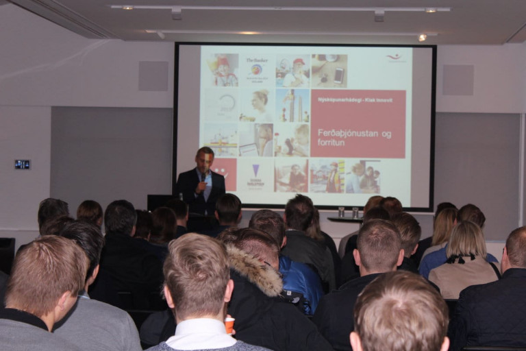 Það var fullt út úr dyrum á Nýsköpunarhádegi Klaks, SI og Stjórnvísi í dag enda þrír frábærir frummælendur á ferðinni sem bæði fræddu gesti og skemmtu á einstakan hátt eins og sjá má af myndum af fundinum. Þema dagsins var: Innganga á erlenda markaði - Hvaða leiðir eru færar?. Frosti Sigurjónsson, stofnandi Dohop hvetur frumkvöðla til að vera sem mest á vefnum, nota leitarvélabestun og nýta sér öll tækifæri sem gefast til þess að vera fyrirlesari og ræða um fyrirtækið sitt. Markaðssetning á vefnum er þolinmæðisvinna sem tekur a.m.k. fimm ár. Hjá Dohop kom vöxturinn smátt og smátt og nú er fræið þeirra byrjað að spíra. Vefsíða Dohop er í dag þýdd á 22 tungumálum. Áhugavert var að heyra að erlendis vill enginn versla við nýtt fyrirtæki en hérlendis eru allir hrifnir að því sem er nýtt. Að komast inn í heiminn þar sem ákarðanirnar eru teknar reynir á þolinmæðina og það er betra að vera númer eitt á einum stað en vera 0,01% í heiminum.