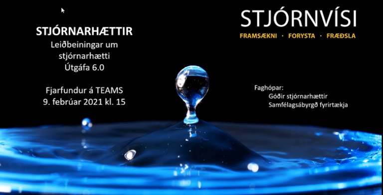 Fundarstjóri var Jón Gunnar Borgþórsson formaður faghóps um góða stjórnarhætti. Jón Gunnar kynnti Stjórnvísi og hvatti alla þá sem ekki væru skráðir í félagið að sækja um aðild. Í framhaldi kynnti hann þá þrjá aðila sem fluttu erindi á fundinum. Frá sjónarhóli stjórnarmannsins: Sigurður Ólafsson, stjórnarmaður í lífeyrissjóði og fyrirtækjum, fjallar um ábyrgð stjórnarmanna á upplýsingagjöf til fjármagnsveitenda. Frá sjónarhóli sérfræðings í fjármálagreiningum: Jeffrey Sussman, ráðgjafi Kontra Nordic, fjallar um mun á algengri íslenskri skýrslugjöf og þess sem koma skal. Frá sjónarhóli fjármagnsveitenda: Snædís Ögn Flosadóttir, framkvæmdastjóri EFÍA, LSBÍ og rekstrarstjóri Lífeyrisauka, fjallar um mikilvægi upplýsinga vegna greiningarskyldu fjármagnsveitenda. (sjá einnig lög nr. 102, 9. júlí 2020: https://www.althingi.is/altext/150/s/1954.html)