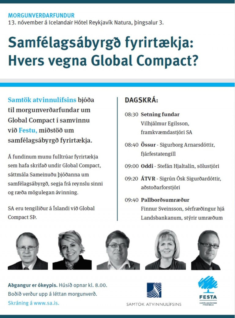 Faghópur um samfélagsábyrgð fyrirtækja vekur athygli á áhugaverðum fundi þann 13.nóvember á Icelandair Hótel Natura, þingsal 3. Það eru Samstök atvinnulífsins í samvinnu við Festu, miðstöð um samfélagsábyrgði fyrirtækja sem bjóða til fundarins.