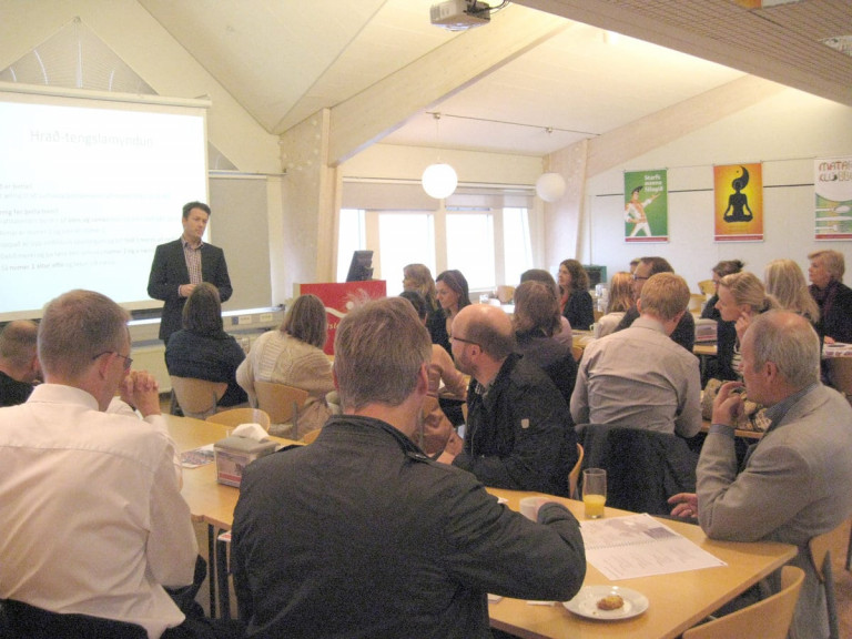 Berglind Helgadóttir, starfsmannasjúkraþjálfari/starfsmaður öryggisnefndar: „Starfsendurhæfing samhliða vinnu“ – sagði frá þróunarverkefni Landspítala og VIRK um starfsendurhæfingu starfsmanna Landspítala samhliða vinnu. Markmið verkefnisins, sem hófst í september 2016, var að stuðla að endurkomu til vinnu í fyrra starfshlutfall eftir tímabundna skerta vinnugetu vegna heilsubrests. Landspítalinn leggur mikla áherslu á teymisvinnu og fjarvistastjórnun. Þegar vinnan hófst voru fjarvistir háar 6,6% 2016. Markmiðið var að vera undir 6%. Erfiðustu fjarvistarmánuðirnir eru fyrstu þrír mánuðirnir. Til að innleiða var haldin vinnustofa fyrir alla stjórnendur. Mikilvægt er að finna út hvað það er sem veldur veikindunum, er það eitthvað sem tengist vinnustaðnum? Berglind vísaði í áhugaverða rannsókn varðandi íhlutun á vinnustað: What works at work? Darcy Hill, Daniel Lucy, Clare o.fl. Skoðað er hvað starfsmaðurinn getur gert, hvað getur vinnustaðurinn gert og eftirfylgni. Tilgangur fjarverusamtals (+10%) er að fara yfir stöðu og ástæðu veikinda, aðstæður á vinnustað og annað. Boðið er upp á hlutaveikindi þ.e. að viðkomandi starfsmaður komi inn í hlutastarf. Starfsmaður sem er í 100% starfi fær 50% starf og 50% hjá Virk. Trúnaðarlæknir metur hvort viðkomandi sé hæfur í verkefnið. Virk ákveður síðan hvort viðkomandi er starfsendurhæfur, gerður er skriflegur samningur. En hvernig hefur þetta gengið? Sex hafa farið inn í verkefnið, einn hefur lokið endurhæfingu og er kominn í fullt starf. Kveikjan við að koma þessu af stað var sú að starfsmaður hefur oft ekki fjármagn nema fara þessa leið.