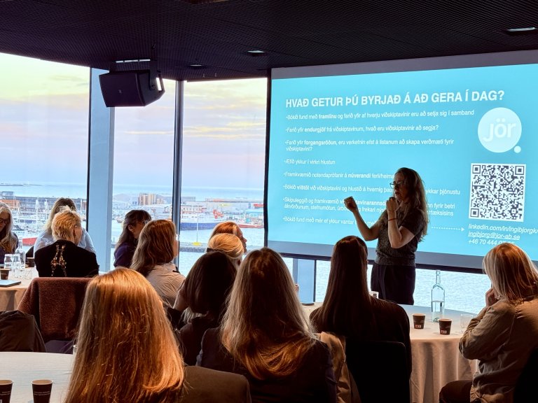 Hvert sæti var skipað þegar Ingibjörg Kristinsdóttir þjónustuhönnuður hélt erindi sitt „Frá innsýn til aðgerða“ í Hörpu. Hún leiddi þar gesti í gengum skemmtilega blöndu af fræðum og reynslu.