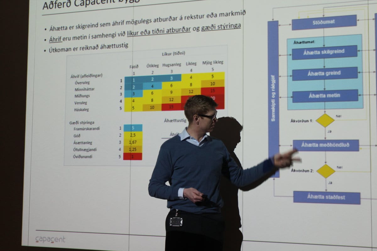 Þá tók við Ólafur R. Rafnsson sem fór yfir hvernig staðið hefur verið að innleiðingu áhættustýringar. Tekið er mið af ISO 31000 og 27005 sem lýsir hvernig farið er í áhættumat. Einnig ISO Guide 73, 27001 og 27002. Capacent vinnur með alla þessa staðla. Áhætta er skilgrein sem áhrif mögulegs atburðar á rekstur eða markmið. Áhrif eru metin í samhengi við líkur eða tíðni atburðar og gæði stýringa. Útkoman er reiknað áhættustig. X-ás : Eru líkurnar/tíðnin fátið, ólíkleg, hugsanleg, líkleg, mjög líkleg. Y-ás: Eru áhrif/afleiðingar óveruleg, minniháttar, miðlungs, veruleg, háskaleg. Mikilvægt er að skilgreina til hvaða aðgerða eigi að grípa til ef áhætta greinist yfir ákveðnum mörkum. KRI - Key Risk Indicator eða áhættuvísar. Oft skapast mikil áhætta við starfslok. Fyrirtæki standa yfirleitt mjög vel að ráðningu en stundum er pottur brotinn varðandi starfslok. Innleiða þarf kerfi og finna ábyrgðaraðila (mannauðsstjóri=riskowner).