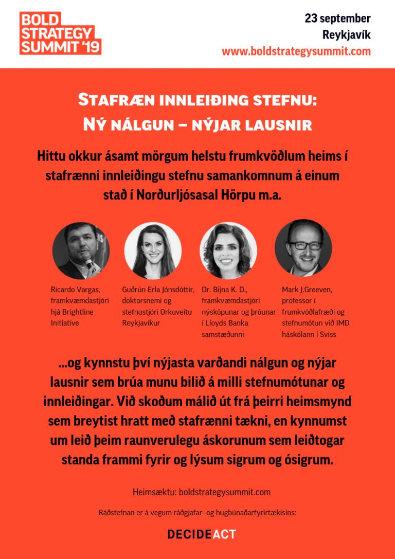 Strategía ásamt faghópi Stjórnvísi um stefnumótun og árangursmat buðu til morgunfundar 27. september þar sem Guðrún Ragnarsdóttir ráðgjafi og meðeigandi Strategiu fór yfir það helsta sem fram kom á ráðstefnunni „Bold Strategy Summit ´19 í Hörpunni. Ráðstefnan fjallaði um helstu áskoranir við innleiðingu á stefnu og deildu þar helstu sérfræðingar á því sviði ásamt íslenskum stjórnendum reynslu og rannsóknum. Þetta var í fyrsta sinn sem slík ráðstefna hefur verið haldin á alþjóðavísu.