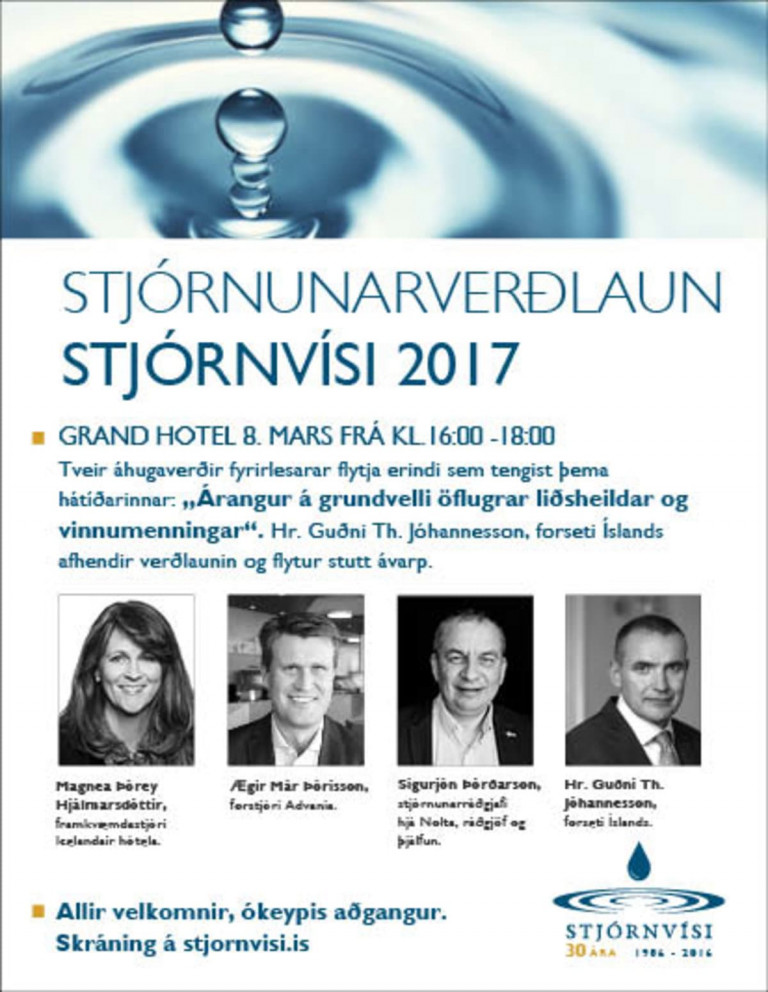 Í tilefni afhendingar Stjórnunarverðlauna Stjórnvísi 2017 hinn 8.mars nk. býður Stjórnvísi til hátíðarmóttöku á Grand hótel, Hvammi, kl. 16.00 til 18.00. Þema hátíðarinnar: Árangur á grundvelli öflugrar liðsheildar og vinnumenningar.