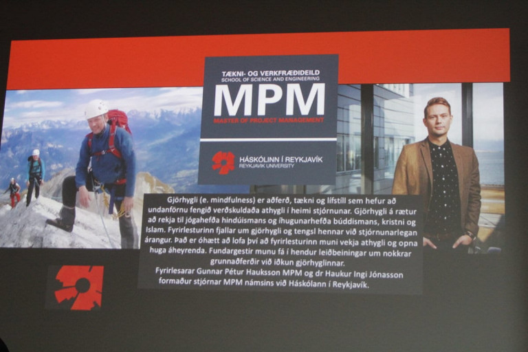 Faghópur um verkefnastjórnun hélt í morgun áhugaverðan fund í Háskólanum í Reykjavík um gjörhygli sem á annað hundruð manns sóttu. Gjörhygli (e. mindfulness) er aðferð, tækni og lífstíll sem hefur að undanförnu fengið verðskuldaða athygli í heimi stjórnunar. Gjörhygli á rætur að rekja til jógahefða hindúismans og íhugunarhefða búddismans, kristni og Islam. Fyrirlesturinn fjallaði um gjörhygli og tengsl hennar við stjórnunarlegan árangur. Fyrirlesturinn vakti mikla athygli og opnaði huga áheyrenda. Fundargestir fengu í hendur leiðbeiningar um nokkrar grunnaðferðir við iðkun gjörhyglinnar. Fyrirlesarar voru þeir Gunnar Pétur Hauksson MPM og dr Haukur Ingi Jónasson formaður stjórnar MPM námsins við Háskólann í Reykjavík. Fyrirlesturinn byggði á lokaverkefni í MPM náminu. Frekari upplýsingar um verkefnið,http://skemman.is/stream/get/1946/22760/47848/1/The_mindful_project_manager.pdf