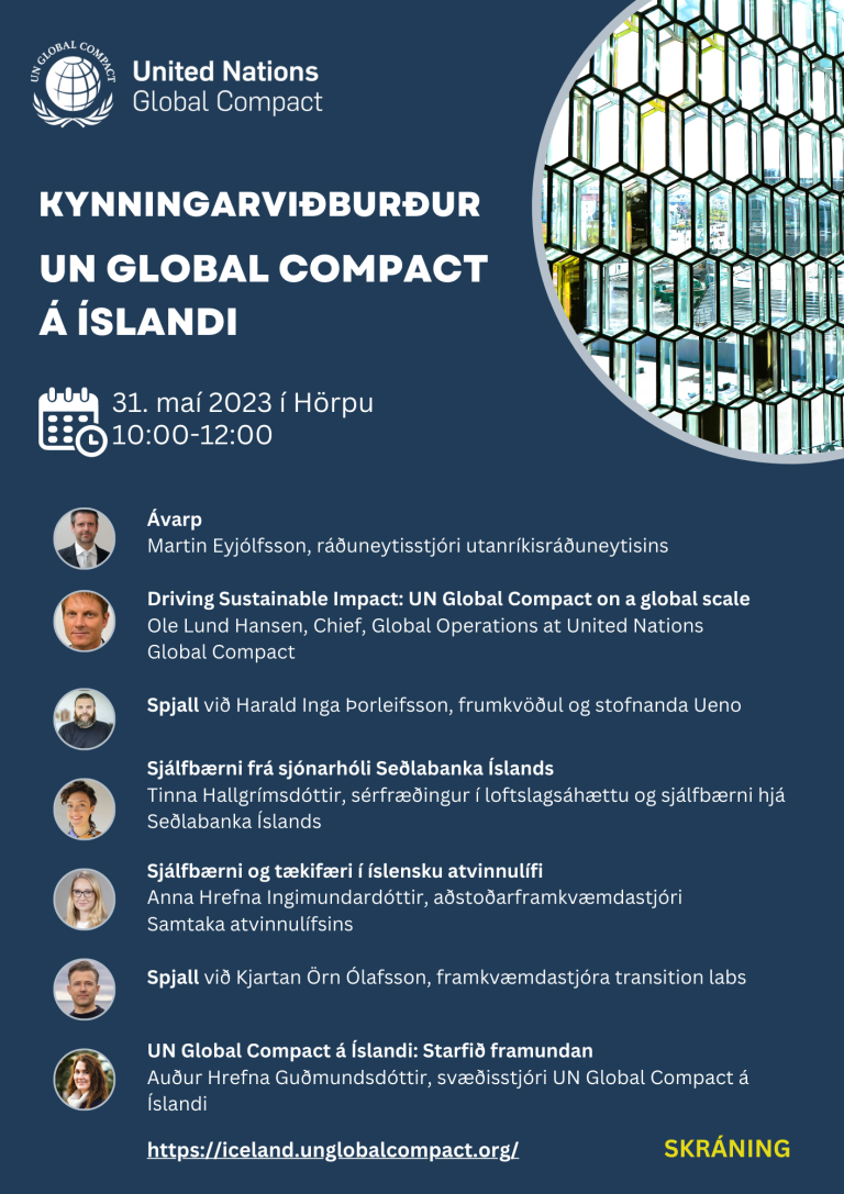 Þér er boðið á kynningarviðburð UN Global Compact á Íslandi sem fer fram í Hörpu þann 31. maí næstkomandi. Fundurinn hefst kl. 10:00 og boðið verður upp á léttar veitingar frá kl. 9:30.