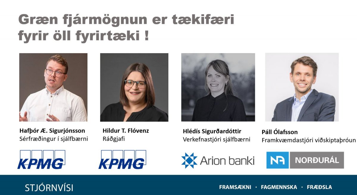 Hafþór Æ. Sigurjónsson & Hildur T. Flóvenz frá KMPG hefja daginn á erindi um sjálfbæra fjármögnun á Íslandi og hver staðan á markaðnum er. Fjallað verður um hvernig sjálfbær fjármögnun hefur þróast á Íslandi allt frá fyrstu grænu skuldabréfunum á Íslandi 2018 hjá Landsvirkjun og Reykjavíkurborg, útgáfu bankanna, og til útgáfu sjálfbærs fjármögnunarramma fyrir ríkissjóð útgefnum af ríkisstjórn fyrir síðustu kosningar.
