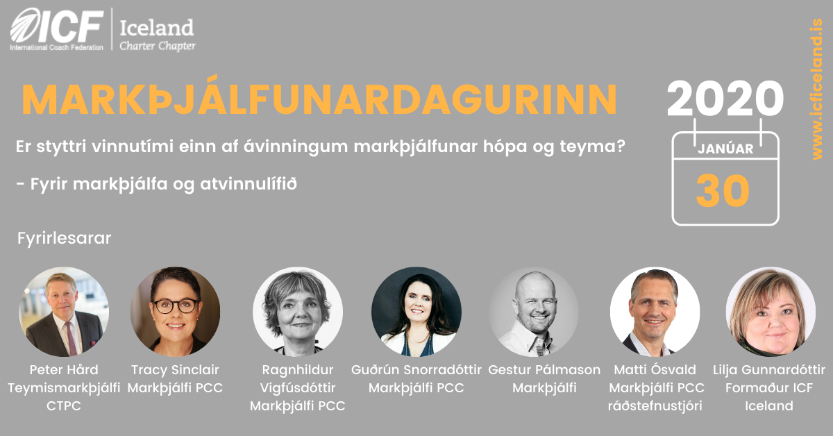 ICF Iceland er mjög umhugað um að ávinningur af markþjálfun berist sem víðast. Sem lið í því höldum við Markþjálfunardaginn og í ár er áherslan á markþjálfun hópa og teyma. Eins og við vitum þá er enginn hópur og ekkert teymi án einstaklinga. Einstaklingur sem fær markþjálfun er sterkur og nær meiri árangri. Hópur eða teymi sem fær markþjálfun styrkist og nær margföldum árangri.