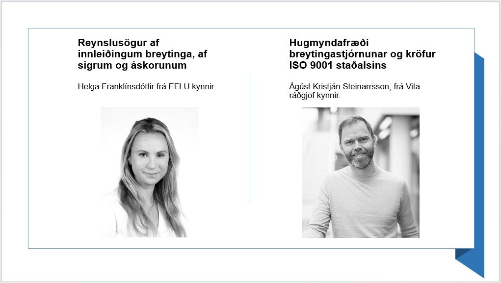 Síðan mun Ágúst Kristján Steinarrsson, frá Vita ráðgjöf, tengja sögu Helgu við hugmyndafræði breytingastjórnunar og jafnframt kröfur ISO staðalsins um breytingastjórnun. Þannig er erindið ekki eingöngu að horfa kerfislægt á breytingar í gæðaumhverfi, heldur einni mannlegar - sem skipta gjarnan höfuðmáli.