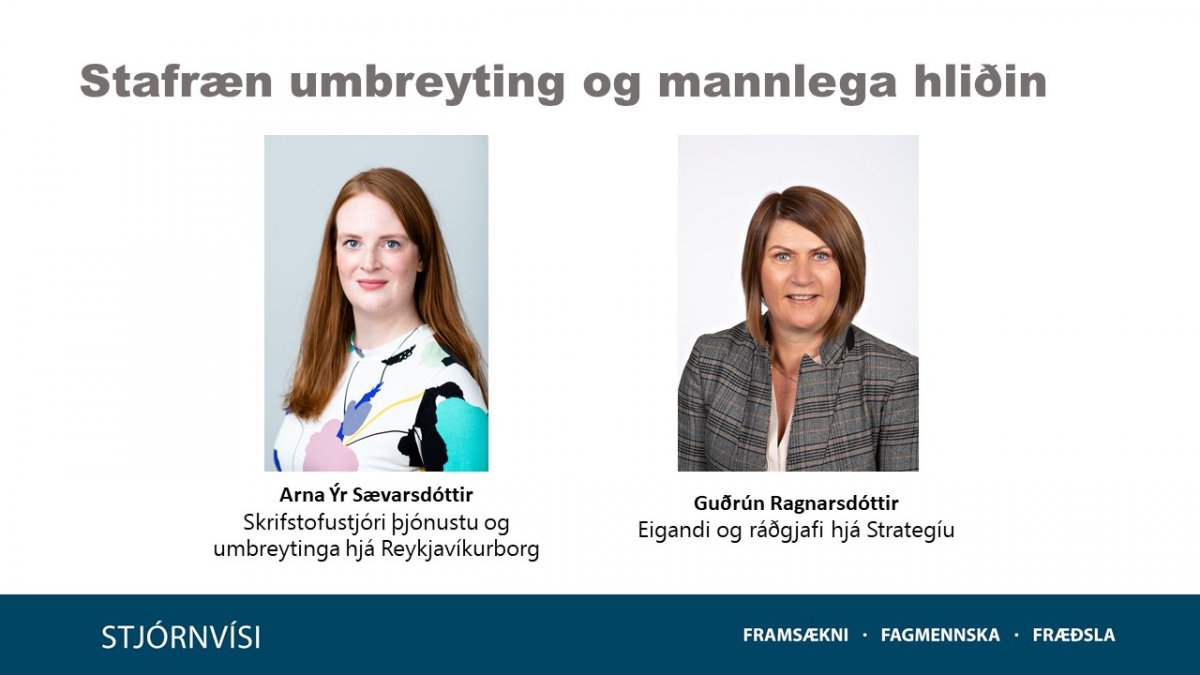 Arna Ýr Sævarsdóttir skrifstofustjóri þjónustu og umbreytinga hjá Reykjavíkurborg mun fjalla um breytingastjórnun í stafrænni vegferð og mikilvægi mannlega þáttarins þegar kemur að því að breyta gamalgrónum hefðum og venjum út frá þörfum notendans með nútímalegum og nýskapandi aðferðum.