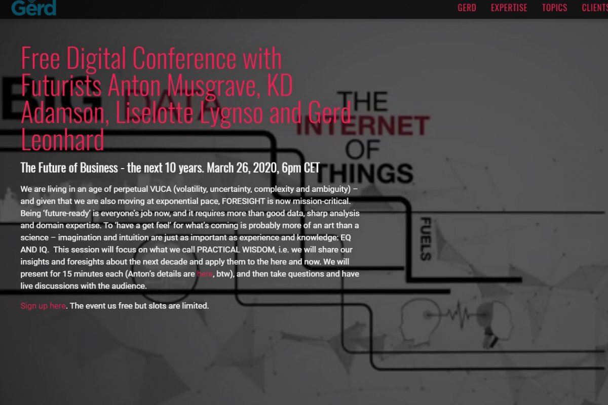 March 26, 6pm CET : FREE Digital Conference with Futurists Anton Musgrave, Gerd Leonhard, Liselotte Lygnso, KD Adamson: The Future of Business